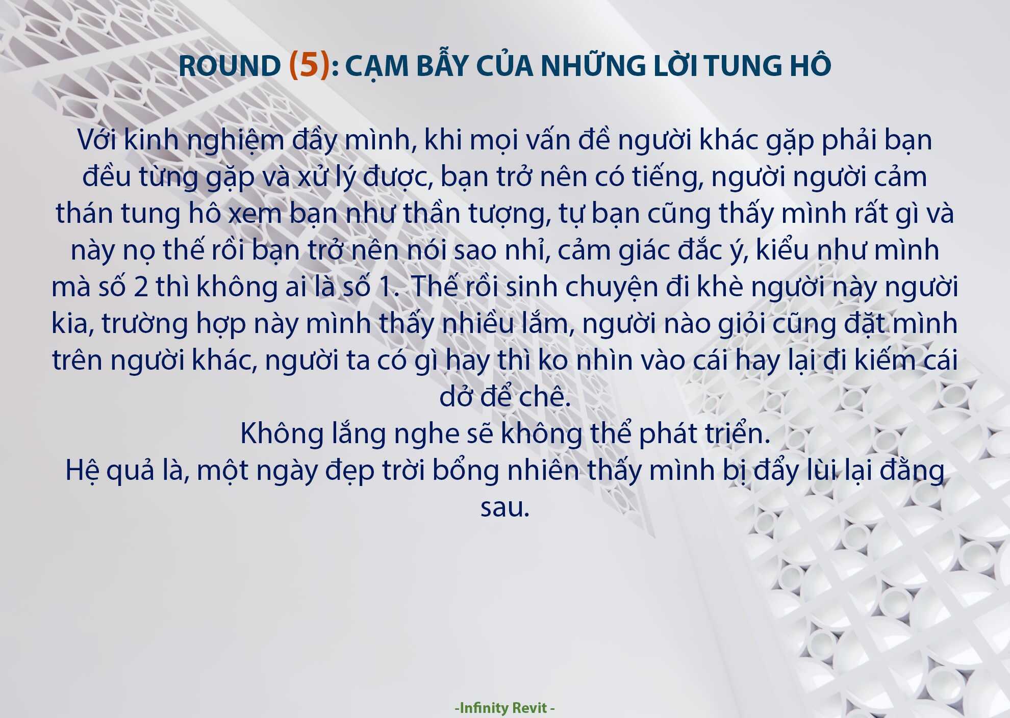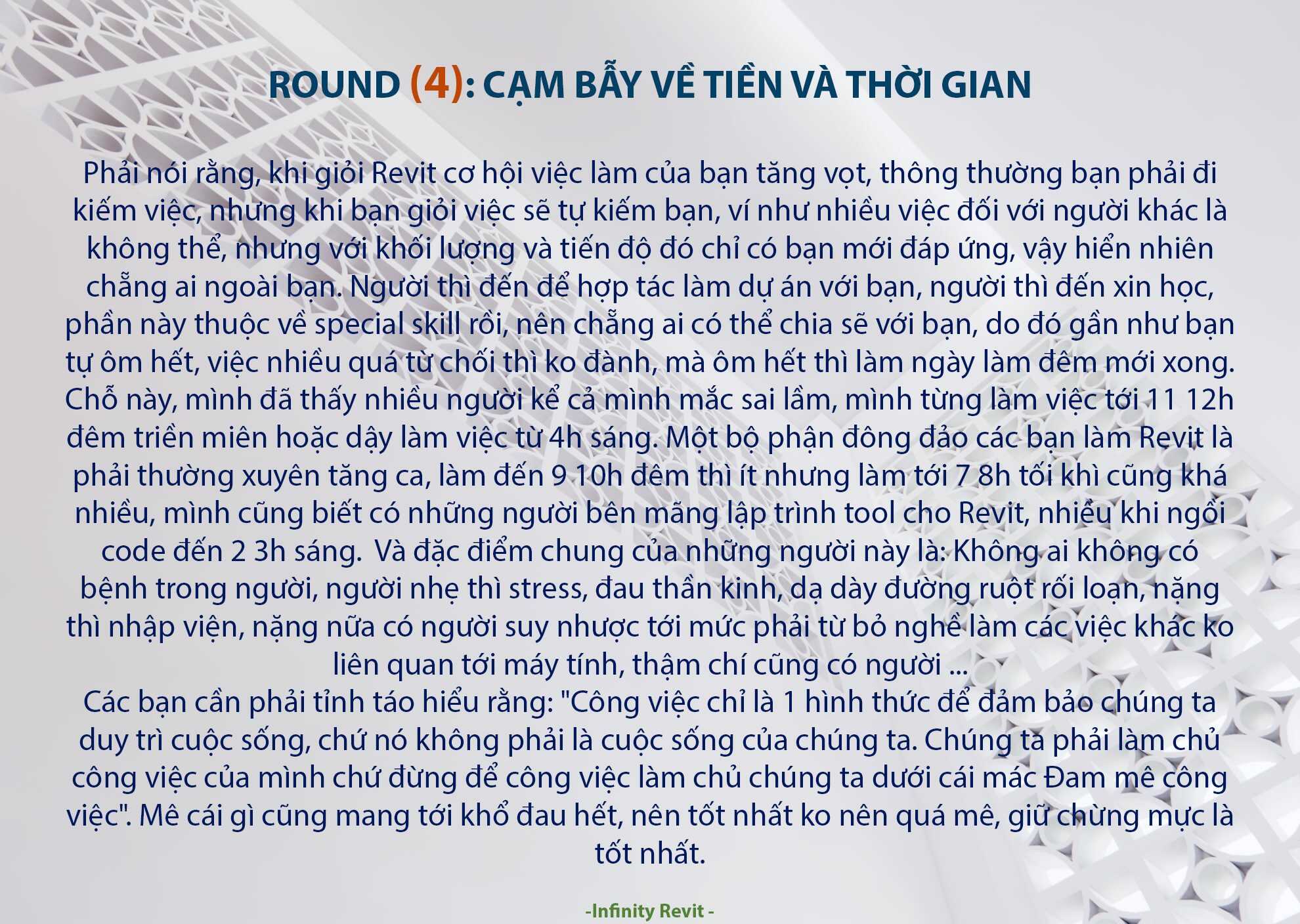 Đôi khi mình cảm thấy dùng Revit như chơi một Endless Game vậy, qua mỗi Round thì có người tiến lên cũng có nhiều người rớt lại rồi từ bỏ, chuyển qua Game khác, cuối cùng cũng có người chơi tới Endless vượt qua những giới hạn mà Revit cung cấp. Cũng có người bị ghiền ko bứt ra được để trải nghiệm các Game khác.