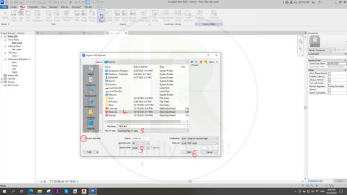 Bước 2: Import model Sketchup vào Family Revit theo trình tự các bước như hướng dẫn trong hình, các bạn lưu ý không tích vào ô Curent view only và chọn đơn vị model lớn một chút cho dễ thấy
