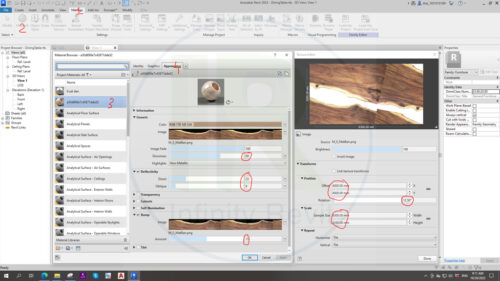 Bước 4: Khi import model Sketchup vào Revit, thì tên của các vật liệu bên Sketchup cũng được đưa vào mục material của Revit, vì vậy các bạn vào Manage/ Material tìm tới tên vật liệu được import vào để điều chỉnh setting trong tab Appearance như hình hướng dẫn. UVmap trong model import nếu bị lệch, các bạn có thể điều chỉnh ở mục Position trong bảng Texture Editor cho tới khi Map vào đúng vị trí trên Model