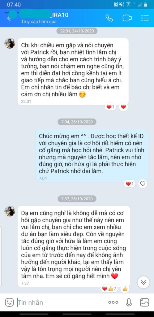 Bạn ấy ấn tượng với việc em theo đuổi con đường em bỏ lỡ nhiều năm, và đề nghị gặp mặt. Cuối cùng bạn khen Em rất có tiềm năng và đồng ý dạy em các kỹ năng thiết kế ID thực tế – điều mà chưa có trường Đại Học nào ở VN đào tạo bài bản.