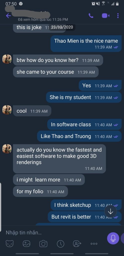 Mình có cô học trò, cầm tấm bằng kỹ sư mới chắc chắn con đường mình yêu thích là Thiết kế Nội thất, em ấy đăng ký khóa học Revit ở mình vì có bạn giới thiệu. Em ấy hỏi mình có nên đăng ký học Ngành Nội thất ở một trường ĐH nào đó không, mình bảo không, nên tìm một công ty chuyên nghiệp học việc sẽ tốt hơn. Em nộp hồ sơ xin học việc nhưng thật khó để người ta nhận một người không có kiến thức nền tảng và cũng không có kinh nghiệm. Vì vậy em bắt đầu trau đồi các kiến thức nền tảng, song song với việc học Revit và Enscape, em cũng chịu khó tìm hiểu về kiến thức chuyên ngành Kiến trúc- nội thất.