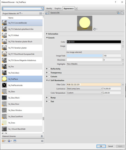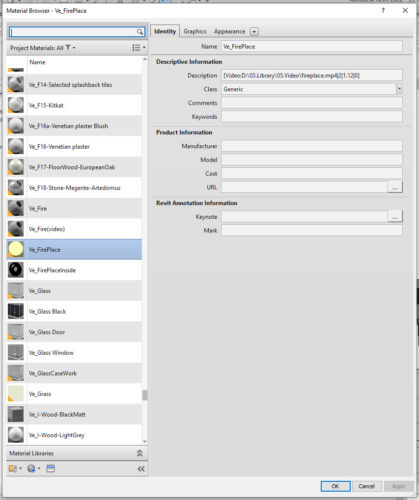 Bước 3: Các bạn tạo vật liệu ngọn lửa để gán cho Model-In-Place ngọn lửa vừa dựng hình xong, mình đang sử dụng vật liệu tên là Ve_FirePlace như hình