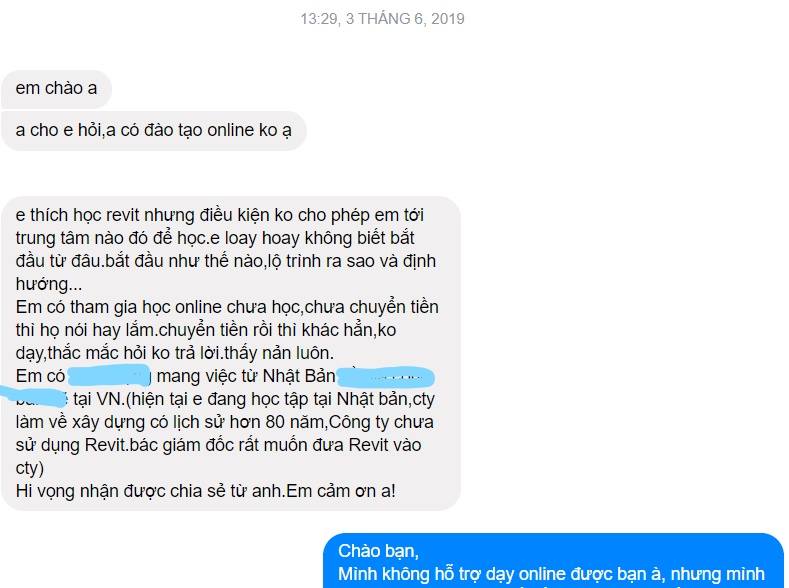 Hồi tháng 6 /2019, mình viết một bài chia sẽ việc áp dụng Revit cho Doanh nghiệp, bất ngờ bài viết đó được chia sẽ rộng rãi, lan sang tận các nước khác. Khi đó anh Vũ Anh đang ở Nhật Bản và được bạn chia sẽ bài viết nên anh đã tìm đến IR. Lúc đó mình cũng chưa dạy online nên giới thiệu ảnh đi học nơi khác. Cuối cùng ảnh lại quay lại hỏi mình lần nữa, ảnh chia sẽ thiệt tình câu chuyện anh đã đăng ký học online nhiều nơi nhưng chưa học được gì, ảnh lại cần dùng Revit cho công việc và dù chưa gặp nhưng ảnh cảm thấy có niềm tin ở chỗ mình. Nghe vậy mình nghĩ thôi thì thử mở 1 lớp online xemsao. Ban đầu nghe giới thiệu mình cũng nghĩ ảnh còn trẻ là du học sinh thôi. Sau này nói chuyện nhiều rồi mình mới biết ảnh lớn tuổi làm việc cho 1 công ty lớn ở Nhật và đưa gia đình sang ở bên ấy lâu rồi.