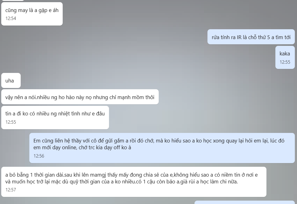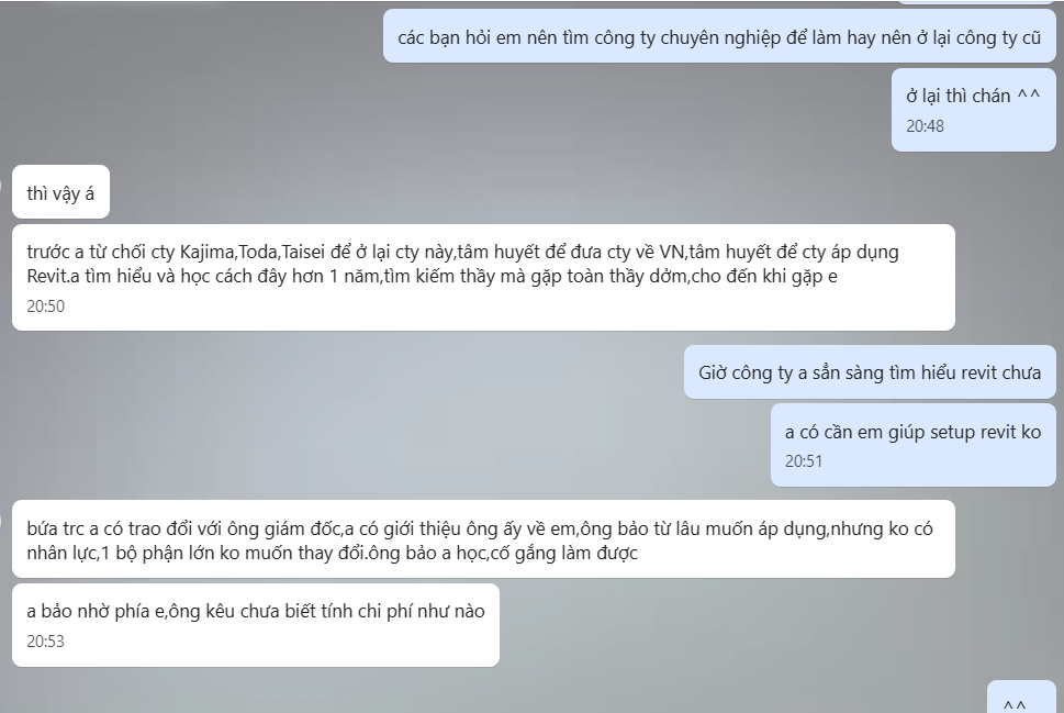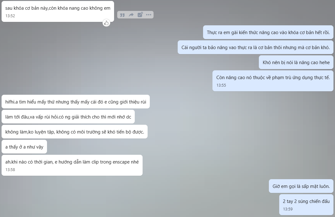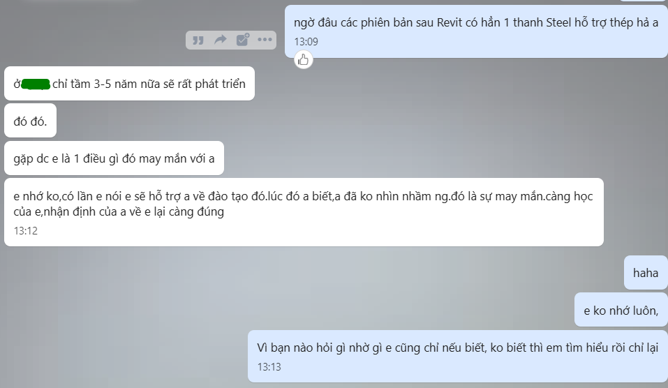Trong khi dạy, ảnh hỏi mình rất nhiều, khi mình giải đáp xong thì đôi khi ảnh hay nói mấy câu như biết ơn cảm kích lắm làm mình thấy kì lạ. Sau này học xong 2 khóa Kiến Trúc và Kết cấu rồi ảnh muốn học tiếp Enscape và Nâng cao, rồi ảnh mới kể rõ chuyện trước kia ảnh cũng đã học Revit online nhiều nơi, IR là nơi thứ 5 ảnh tìm tới. Thế nên học xong ảnh rất quý tụi mình.